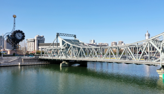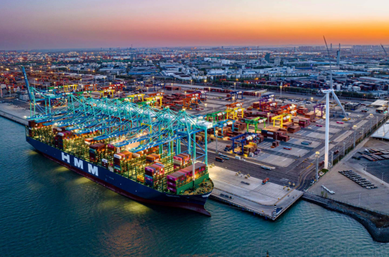 一艘集装箱船停靠在天津港的“七彩码头”。
