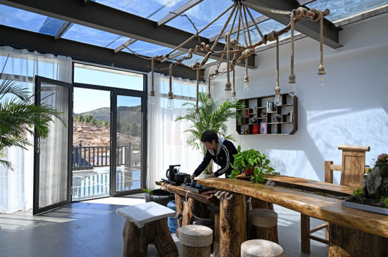 天津市蓟州区罗庄子镇二十里铺村一家民宿的负责人在整理茶具。