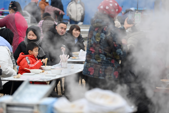 人们在天津市蓟州区西路庄大集上品尝特色小吃。