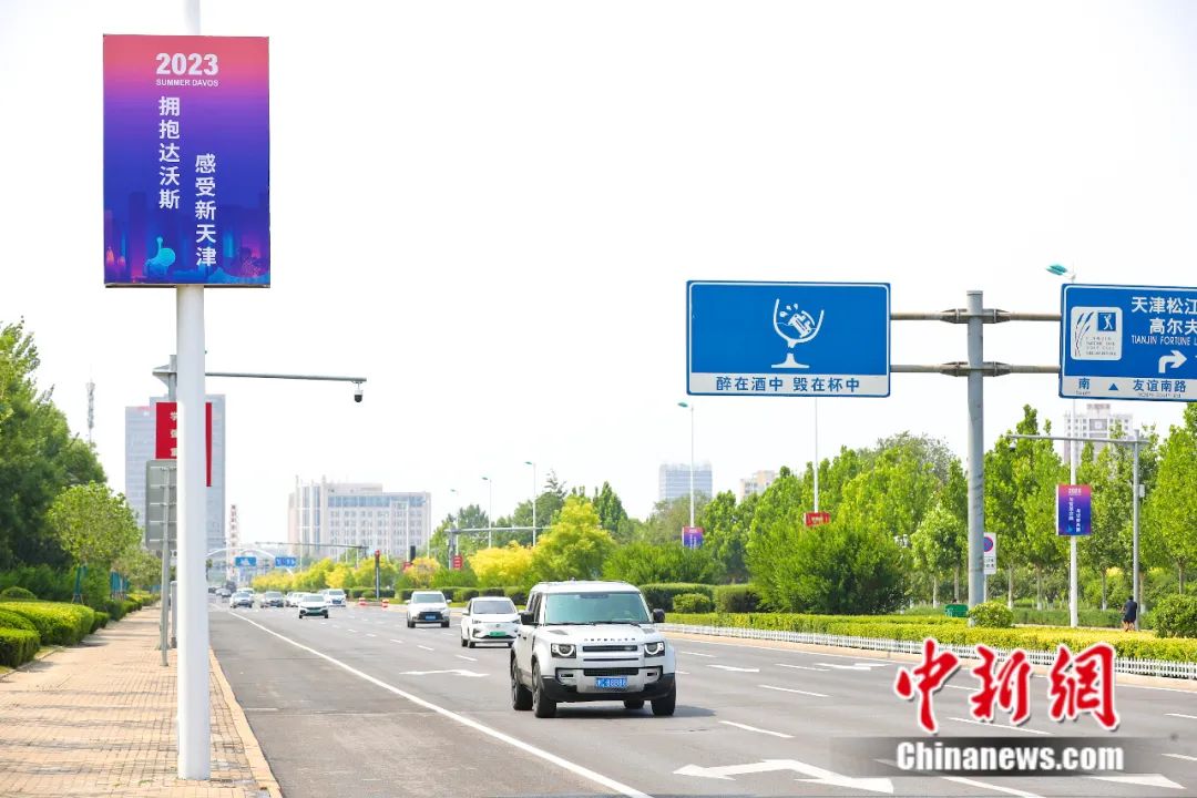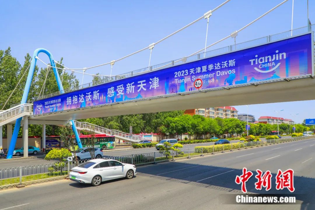 天津主干道、人行天桥悬挂着“拥抱达沃斯 感受新天津”等内容的宣传标语。