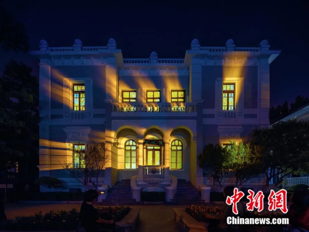 图为“五一”假期,位于天津市意风区的梁启超故居纪念馆建筑外墙开启灯光秀表演。