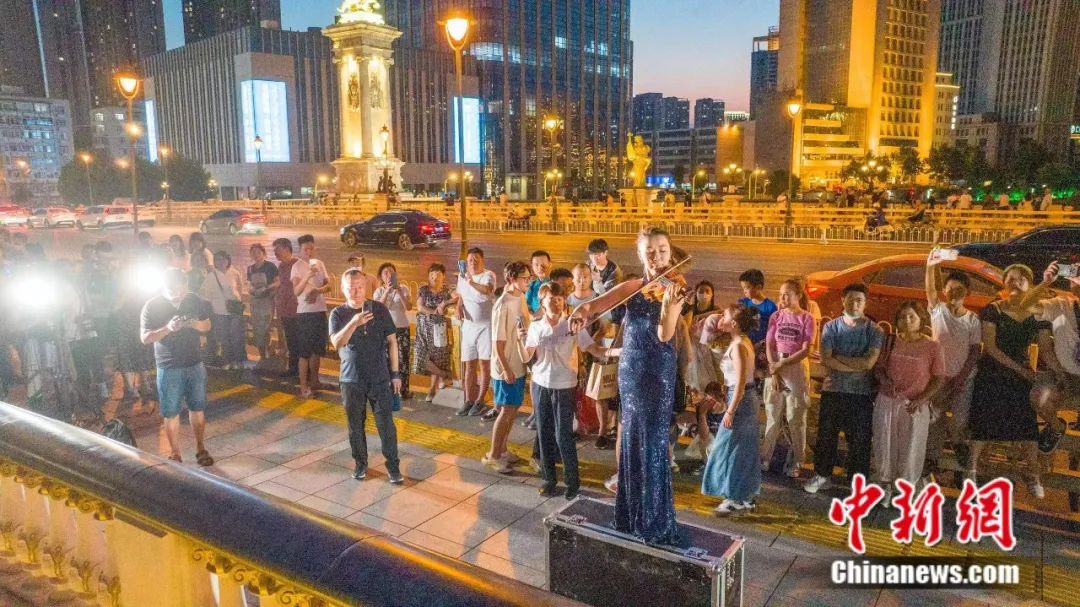 图为2023天津海河音乐节期间岸边的小提琴演出。