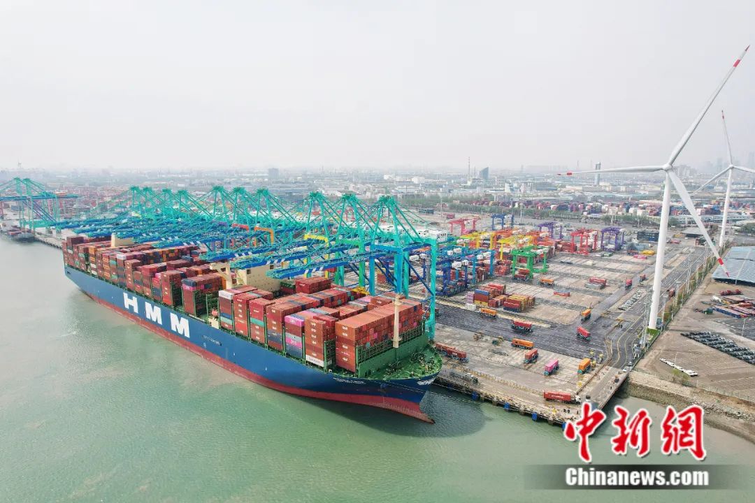 图为2023年4月6日,“现代哥本哈根”轮顺利靠泊天津港北疆港区C段智能化集装箱码头开始进行装卸作业。