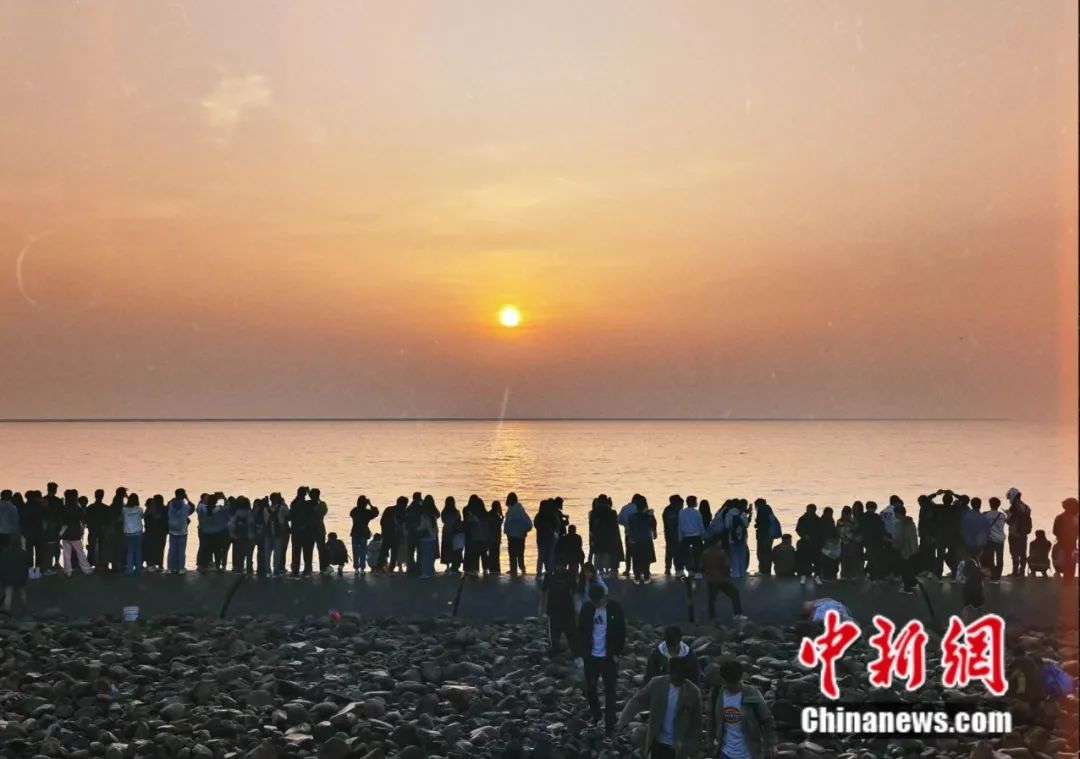 图为2023年五一期间来自四面八方的人们在观看海上日出。
