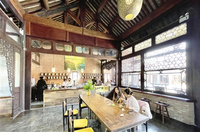 “上一个坐在这里喝茶的人,大概得是百年前了。”穿着中式马面裙的服务员笑盈盈地将人拉回现实,“这位女士,咖啡、中式茶饮、特色点心,您想来点儿什么吗?”