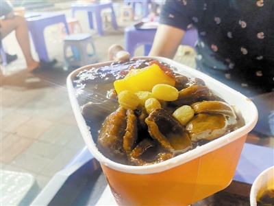 在一家户外刨冰摊位前,几位小姑娘望着眼前的刨冰愣神,她们没想到花15元钱能换来一座实实在在的“冰山”。只见做刨冰的阿姨不停地往冰里加入红豆、炼乳,一层果料一层冰,最外层再浇上一层菠萝块。一位小姑娘笑着说:“都说天津人实在,这次算亲眼见识了。”