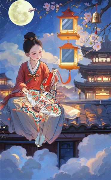 第二幅作品名叫《思物》,结合天津传统文化,把墙体上的窗户设计成了一个古代的灯具,也是天津非遗产品周记宫灯。一个汉服小女孩坐在墙头拽着灯坠,她手里拿着的是风筝魏的风筝,背景是古时候的铃铛阁。作品传递出一种不忘根本、不忘文化传承的理念。第一幅是朝阳,有的市民就提出,第二幅不如来个明月吧,可以呼应。于是明月当空、花开枝头,就这样呈现在画作中。