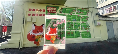 除了西北角的大型墙绘引人注目,洪湖里的墙绘也受到不少人的欢迎。洪湖里的最新形象大使名叫“洪小狸”,是一只可爱的红色狐狸,“洪小狸”旁边是非常详细的洪湖里美食地图。墙绘位置明显,很多来洪湖里品美食的游客都会先驻足这里,找到想吃的,拍下地图的照片,跟着地图找美食。红桥区西于庄街相关工作人员介绍,今年9月初开始谋划设计这组墙绘,9月底确定了设计稿的最终版,经过三天的绘画,终于在国庆假期与游客见面。“未来,我们还计划整合洪湖里的资源,将美食与旅游相结合,让洪湖里这一片区又好吃又好玩。”该工作人员介绍。
