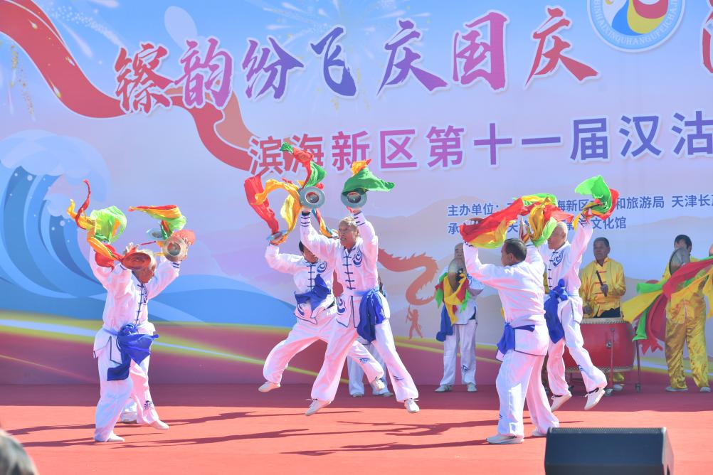 2024年10月1日,天津滨海新区,15支汉沽飞镲队伍轮番登台表演。(滨海新区融媒体中心供图)