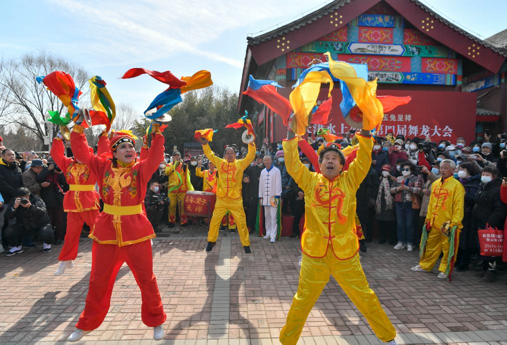 2023年2月21日,在天津市水上公园,民间艺人表演汉沽飞镲。新华社记者 孙凡越 摄
