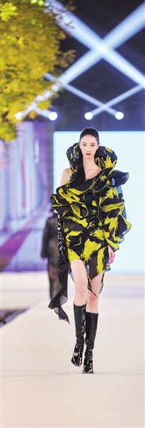 例如另一套时装,在色彩运用上,首先引人注目的是黑纱上的金绿提花,是对苔藓绿的夸张化表达。“这款服装对苔藓绿的运用进行了极致化的处理,使得整体色调呈现出一种夸张且鲜明的基调。其次,该服装采用了相对复杂的立裁设计,这种结构对工艺以及打版水平的要求极高,展现了蜿蜒海河的独特美感。观察服装的整体线条,其流畅性如河流般蜿蜒崎岖,同时蕴含着花开的意象,宛如一朵盛开的河流之花,寓意着海河周边灿烂的民间文化。”王紫菲说。
