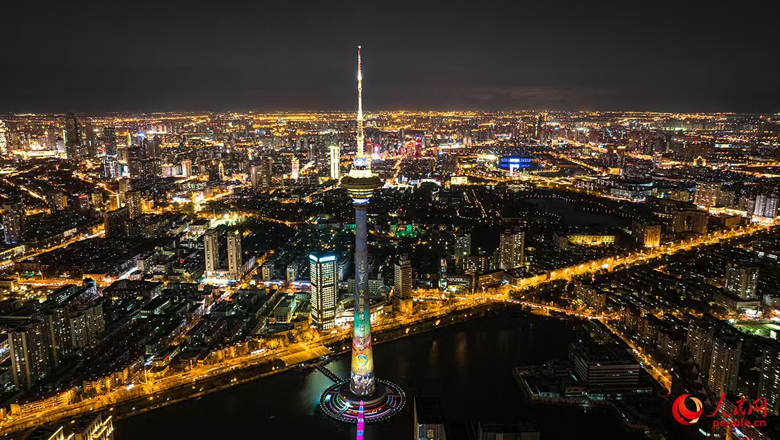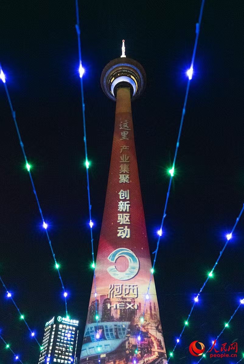 天津河西在天塔点亮城区形象主标识。人民网 杨僧宇摄