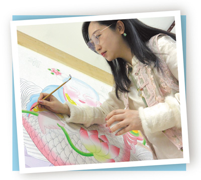 【镜头】天津市西青区霍庆有年画博物馆里人流如织,杨柳青木版年画区级代表性传承人王丹(见图一,受访者供图)站在年画“连年有余”前,一边上色一边给前来参观研学的学生详细讲解。