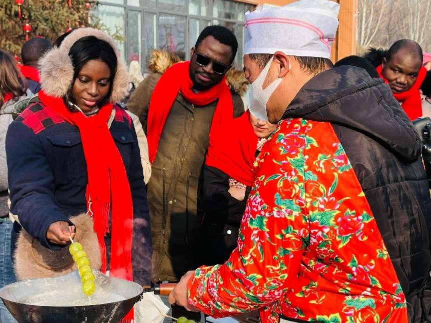 除了非遗美食,留学生们还在现场亲手体验了非遗刘氏石磨元宵和冰糖葫芦的制作技艺。