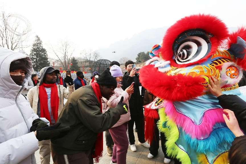 冬日的黄崖关长城满是新春氛围,舞龙舞狮、背阁表演、古彩戏法……各种民俗、杂技在这里轮番上演,留学生们观看这些中国传统文化演出,新奇不已。