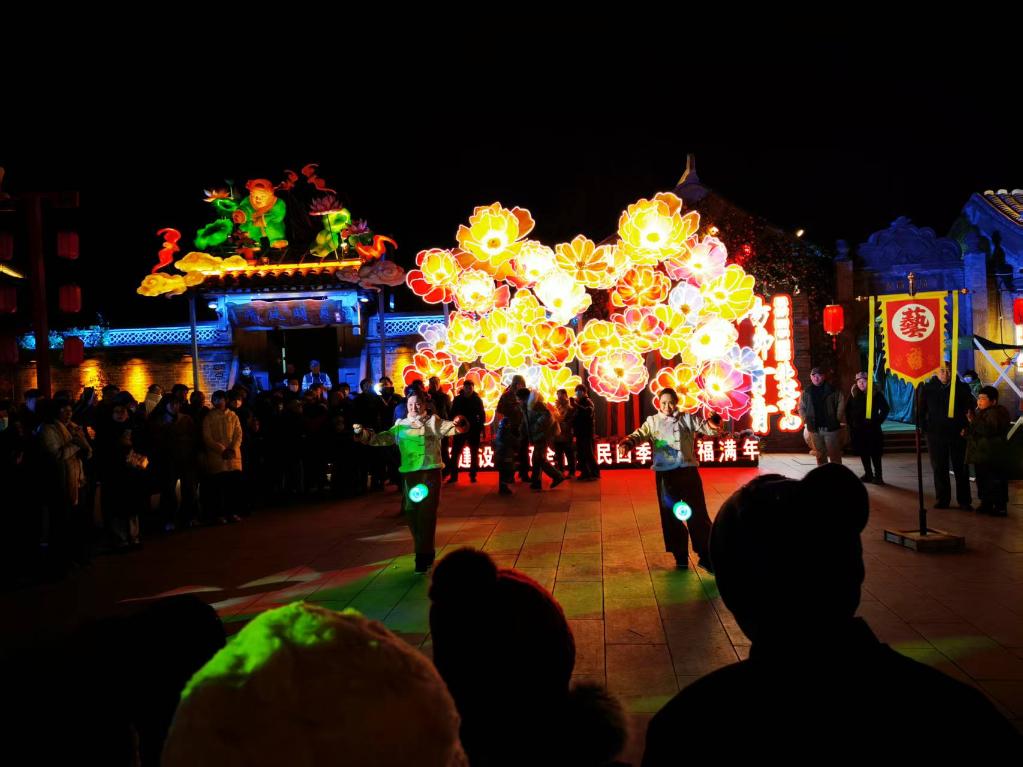 行至地标性建筑——戏楼,一曲经典评剧《杨柳青传奇》正在上演,戏曲演员的一招一式,尽显功力。台下,中幡在舞者头、肘、肩、背、手、指间来回“跳跃”,空竹、飞叉等“高难度”表演,让人鼓掌叫绝。“精彩纷呈的演艺表演,让人不虚此行。”第一次来此的山东游客杨恩广已沉浸在过年欢天喜地的气氛中。