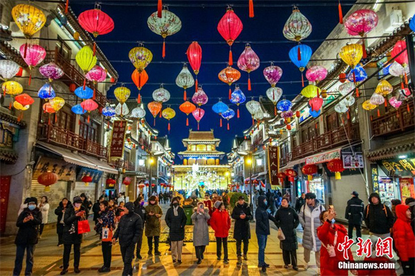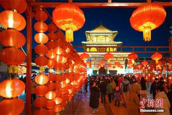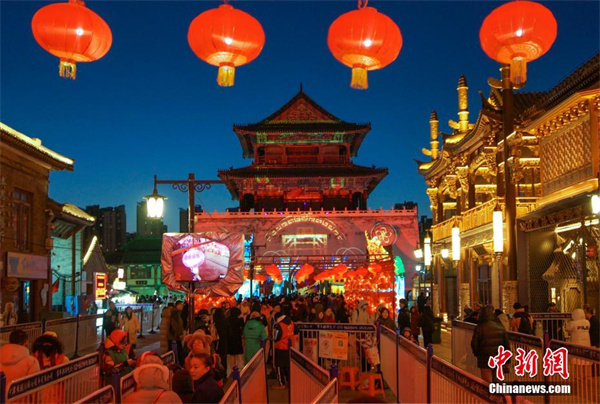 2月3日晚,市民和游客在天津鼓楼“大明风华巷鼓楼奇趣夜”古风光影市集打卡游玩,沉浸式体验“津”彩假期夜。中新社记者 佟郁 摄