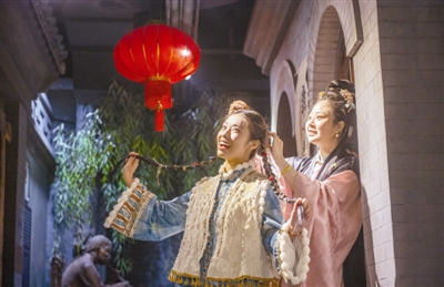 在杨柳青民俗文化馆内,沉浸式互动戏剧《吉祥如意》正在进行中。该剧剧情中以年画文化为主线,融合了赶大营文化、民俗文化、运河文化、大院文化等杨柳青特有的历史文化元素。