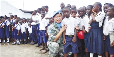 周朝晖(中)代表中国维和部队慰问利比里亚蒙罗维亚小学
