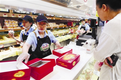 正在挑选月饼的刘先生对记者说:“我比较喜欢吃传统口味的月饼,觉得有节日的氛围,但我爱人喜欢尝试新口味。这里月饼种类这么丰富,我们都能选到自己喜欢的,太方便了。”