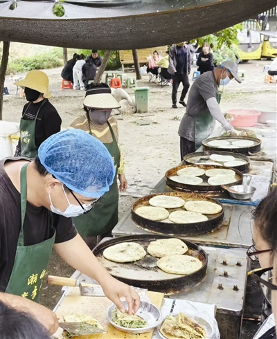 如果想品尝地道的宝坻美食,潮白河老李肉饼可太火了。到了潮瑞大桥与潮白河左堤路交口,老远就瞧见那冒着热气的大饼铛和一群人围坐着,就知道肯定是老李肉饼摊啦。瞅着老李那熟练的手法,揪面团、包馅料,一气呵成。听旁边的老顾客说,他家有6种馅料呢,除了牛肉、猪肉这些常见的,还有河底肉、田螺肉、鸽子肉这些特色馅料。