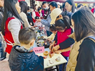 这场活动让社区里的孩子在短时间内接触到众多非遗代表性项目——盘扣、泥塑、漆画扇、糖葫芦制作、植物拓印、手绳编织、传统剪纸等非遗体验摊位前人头攒动,非遗代表性传承人现场手把手指导,孩子们专注创作,亲手完成专属小作品,沉浸式感受传统技艺的独特韵味。孩子们在趣味体验中解锁“非遗”文化知识,在打卡实践中传承匠人精神,这场文化与欢乐交织的市集,收获了满满的知识与欢乐。