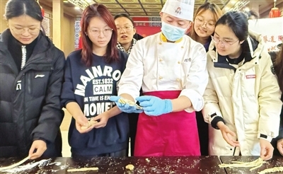 日前,在河西区西岸非遗体验馆,大学生在桂发祥技术人员的指导下,体验十八街麻花制作技艺。