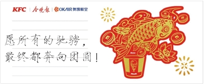 在农历腊月二十三小年到来之际,“非遗过大年·上云端”活动将围绕“过年回家”的主题温暖开启。1月21日,今晚报联合肯德基、奥凯航空,为千万从天津启程回家的乘客“送报送福送美食”。在天津滨海国际机场BK3203航班登机口,乘坐“新年金桶号”主题航班的乘客不仅有机会获赠当日《今晚报》,还有机会获得非遗礼品——满汉双文书写技艺“天下第一福”字墨宝,以及肯德基“乒乒乓乓大金桶”的美食。此外,登机旅客还将获得《今晚报》、肯德基与奥凯航空的联名纪念机票。让万米高空的旅程既有文字和墨宝的“诗和远方”,更有美食贴心相伴,使回乡路满载深情与厚谊。
