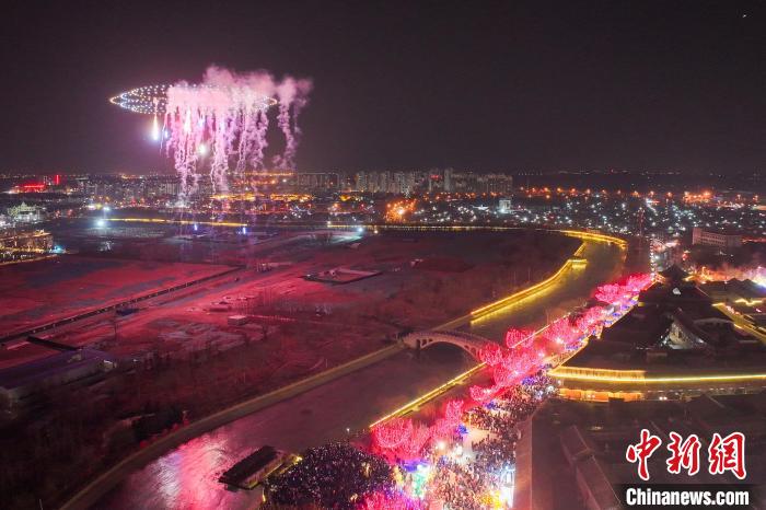 2月9日晚,市民和游客在天津西青区杨柳青古镇赏花灯,观看无人机烟花表演。(无人机照片)中新社记者 佟郁 摄