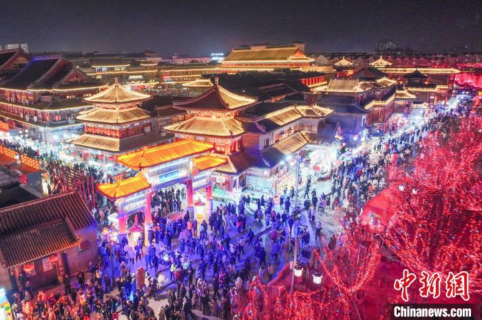 2月9日晚,市民和游客在天津西青区杨柳青古镇赏花灯。(无人机照片)中新社记者 佟郁 摄