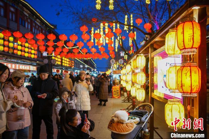 2月9日晚,市民和游客在天津西青区杨柳青古镇赏花灯,游玩拍照。中新社记者 佟郁 摄