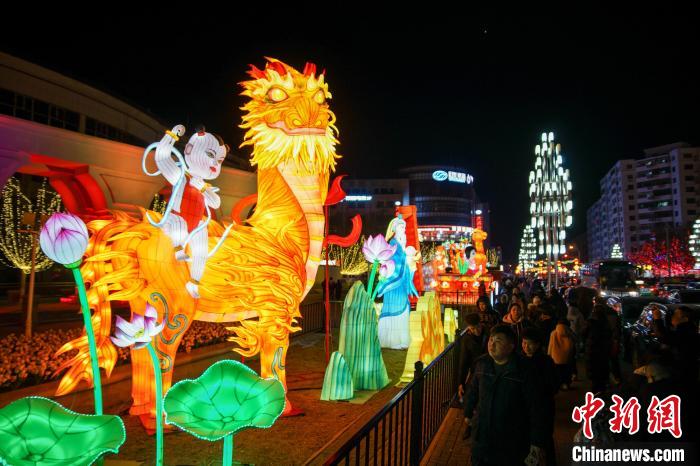 春节期间,天津杨柳青古镇举办的花灯展吸引了大量游客。夜幕降临,杨柳青古镇被各式各样的花灯装点得璀璨夺目,吸引了众多游客前来观赏。
