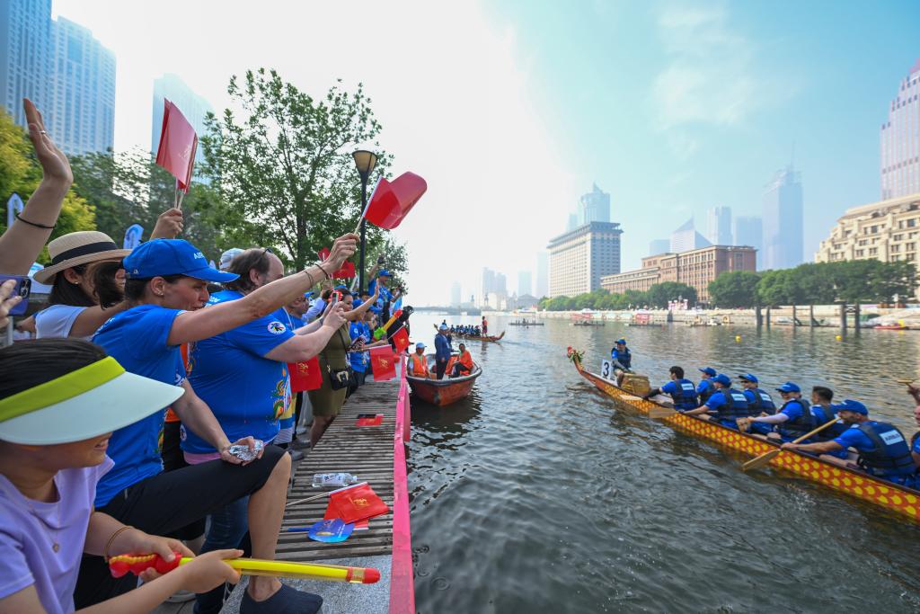 当天在200米直道竞速赛场,不同国籍、不同肤色、不同语言的选手齐聚海河,笛声、鼓声、划桨声和两岸数万名观众的呐喊声、欢呼声交织在一起,奏响世界文化交融绽放的交响曲。