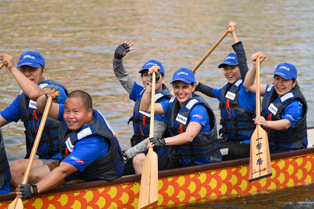 6月10日,在天津海河龙舟赛上,岸上观众和选手向刚刚完成预赛的空中客车龙舟队打招呼。新华社记者 孙凡越 摄