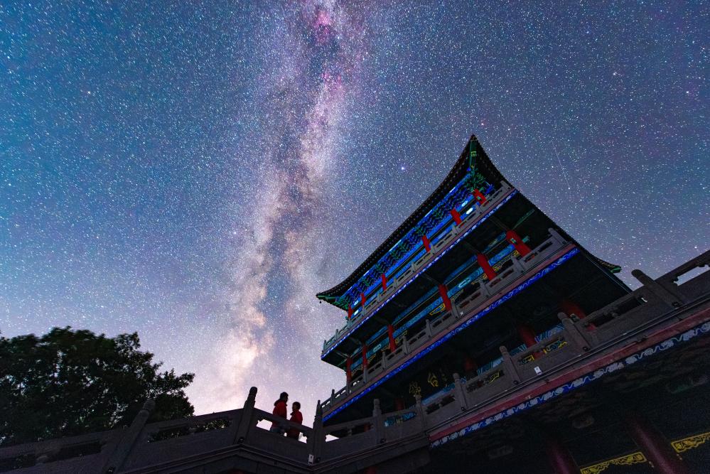 在黑龙江省佳木斯富锦市锦山镇,一对情侣在观赏银河和两侧的牛郎星、织女星。新华社发(曲玉宝摄)